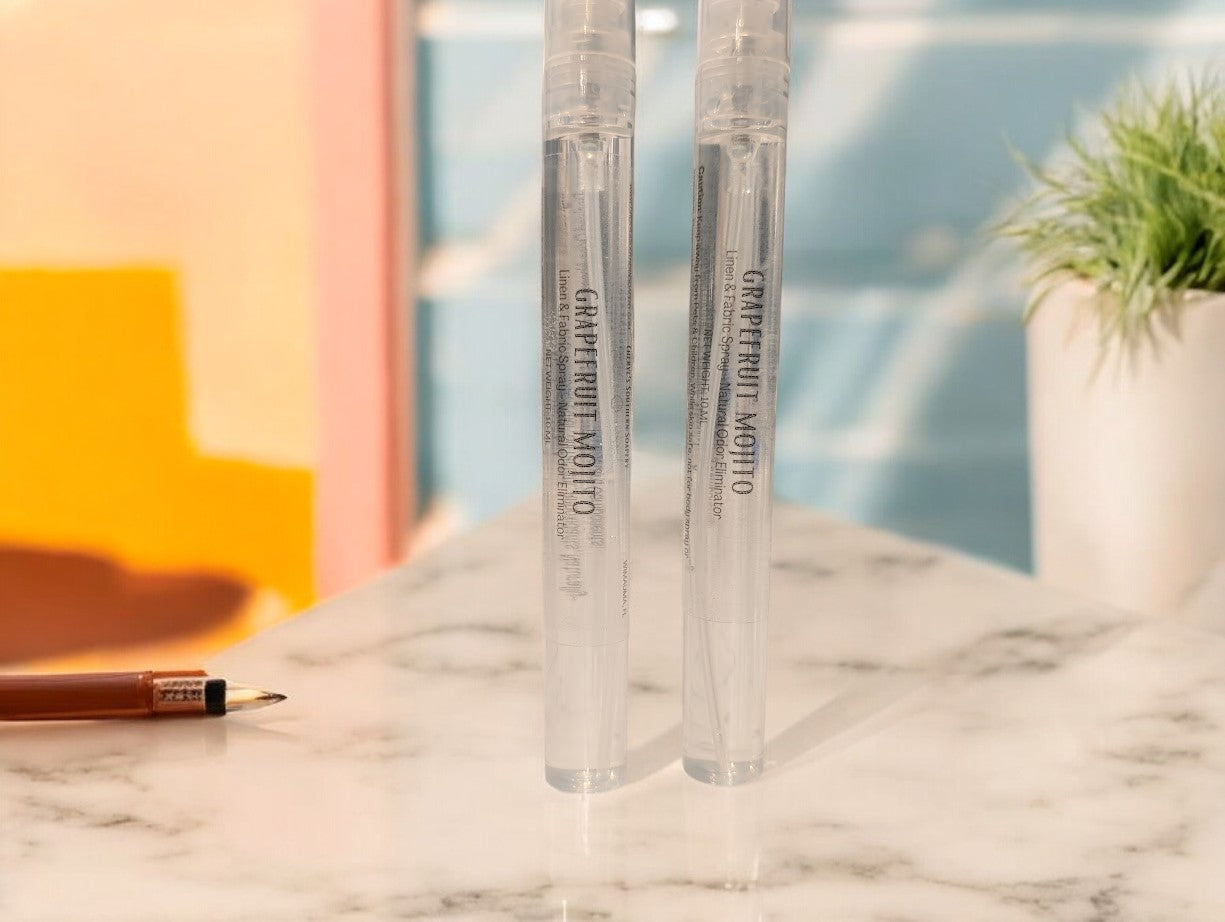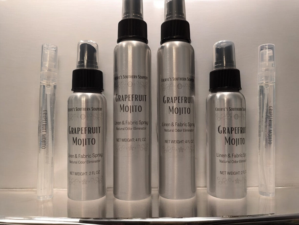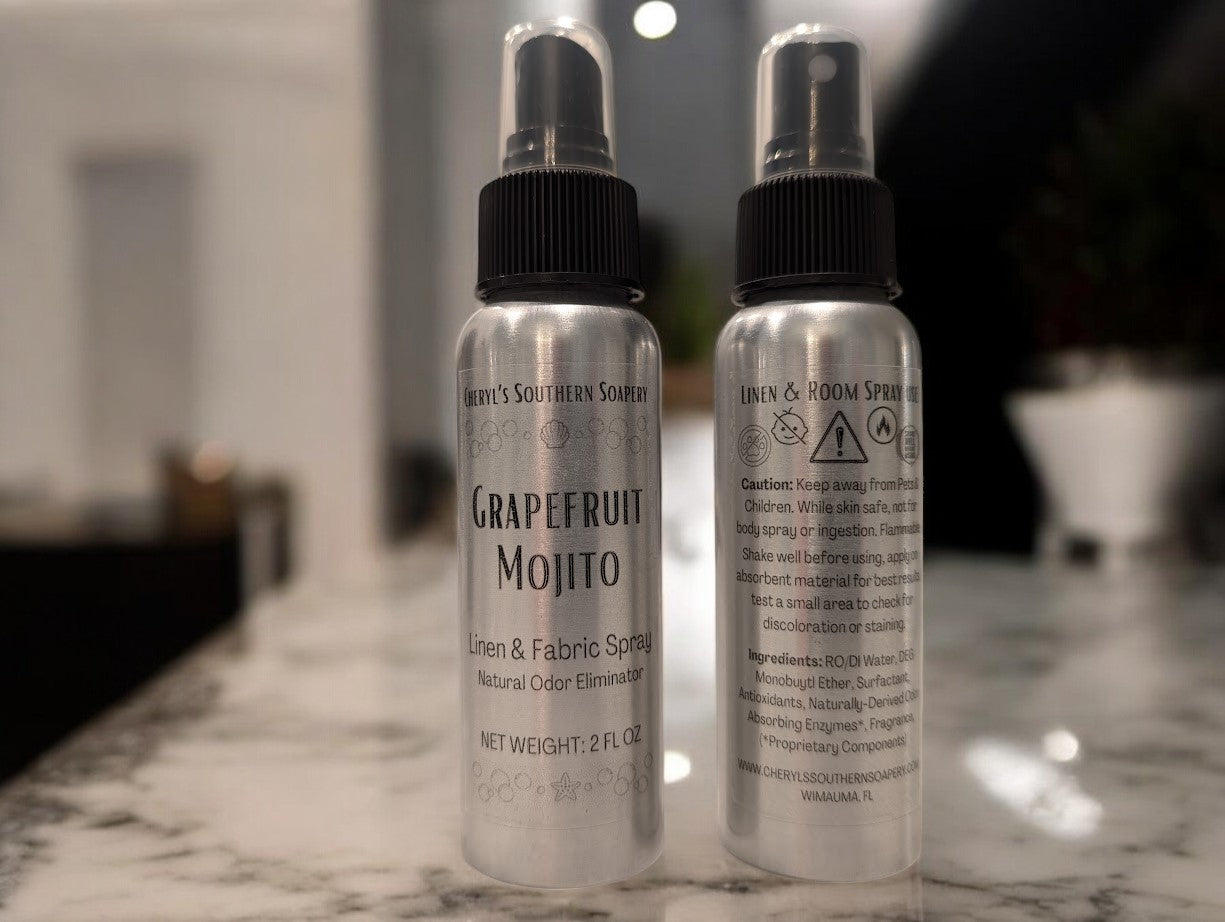 This Fabric and Linen Refresher features a vibrant citrus blend, highlighted by top notes of rhubarb and grapefruit, alongside mint and lavender, with base notes of vanilla and thyme. It evokes the essence of a grapefruit mojito.