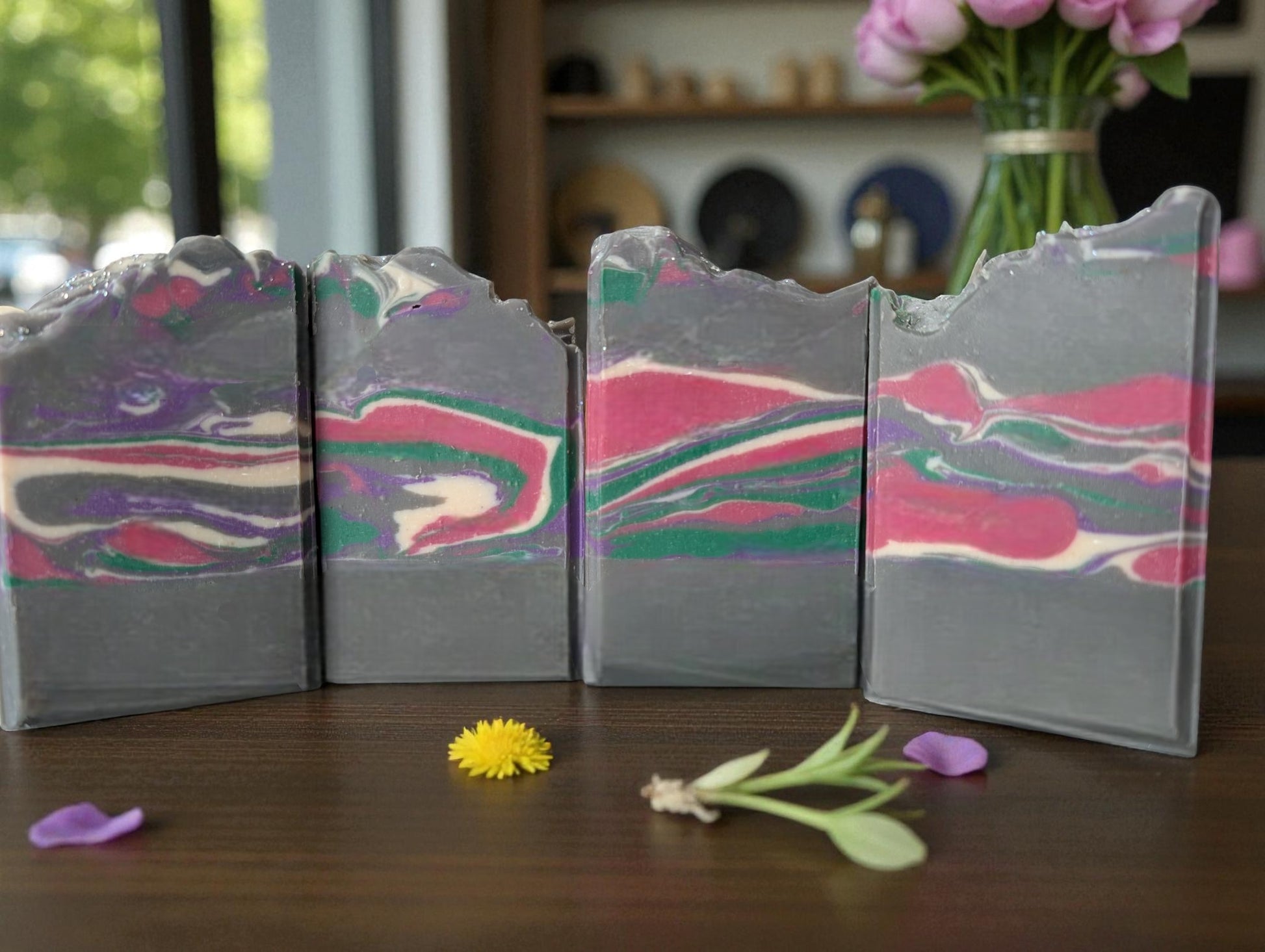 Skin Lovin' Ingredients in the Pot: Palm Oil, Coconut Oil, Aloe Vera Juice, Olive Oil, Rice Bran Oil, Lye, Kaolin Clay, Fragrance, Castor Oil, Goat Milk, Sugar, Colloidal Oats, Sodium Lactate, Citric Acid Powder, Mica, Titanium Dioxide, Tussah Silk